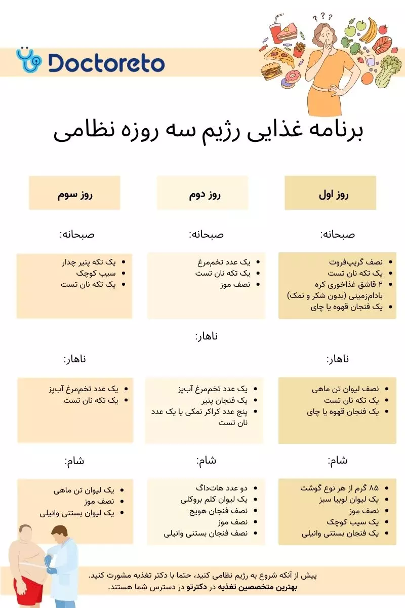 اگر قصد دارید رژیم نظامی سه روزه را امتحان کنید، حتما با متخصص تغذیه مشورت کنید. ممکن است این رژیم برای شما مناسب نباشد. برای ارتباط با متخصصان تغذیه میتوانید از طریق سایت دکترتو اقدام کنید. در دکترتو امکان مشاوره حضوری، آنلاین و تلفنی وجود دارد.