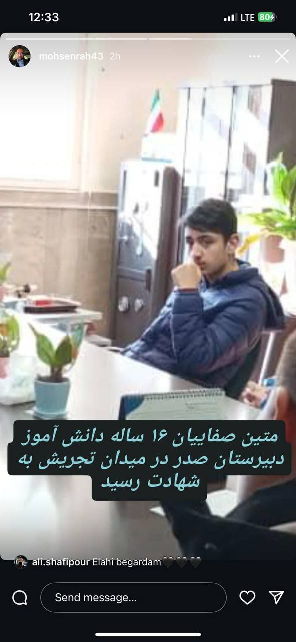 دانش آموز ۱۶ ساله در پی حمله اسرائیل به تجریش به شهادت رسید.