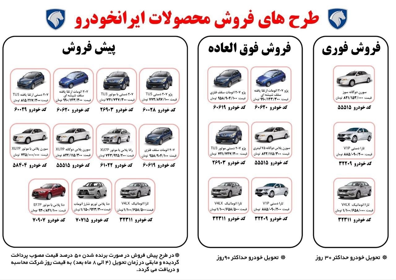 ثبت نام محصولات ایران خودرو برای تیر ۱۴۰۴ از طریق سامانه رسمی ikcosales.ir آغاز شده و متقاضیان میتوانند در طرحهای فروش فوری، پیشفروش و فروش فوقالعاده با رعایت شرایط مربوطه ثبت درخواست کنند. همچنین متقاضیان طرح عادی باید حساب وکالتی با موجودی مشخص افتتاح کنند و مهلت ثبت نام تا پایان روز چهارشنبه ۱۸ تیرماه ۱۴۰۴ است.به اطلاع نمایندگیها و متقاضیان محترم میرساند، به منظور تسهیل خرید مصرف کنندگان واقعی خودرو، شرکت ایران خودرو در نظر دارد مجددا بخش دیگری از ظرفیت تولیدات خود در سال ۱۴۰۴ را در قالب طرحهای فروش فوری، فوق العاده و پیش فروش طی اولویت بندی عرضه نماید.
