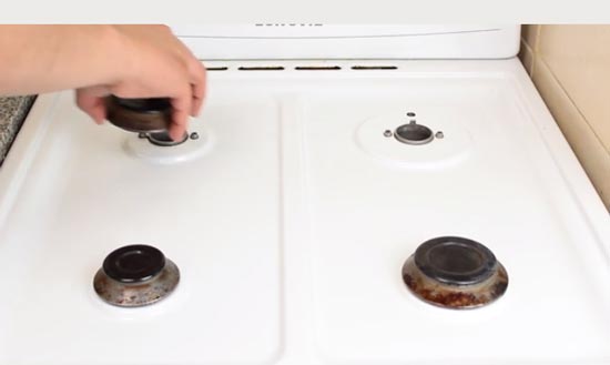 ۳- لکههای سخت را با مخلوطی از جوش شیرین و آب تمیز کنید. به مقدار مساوی آب و جوش شیرین را با هم مخلوط کنید تا شکل خمیر بشود. سپس آن را روی لکههای سخت یا خیلی چرب مشعل بمالید. اجازه دهید تا ۲۰ دقیقه این خمیر روی مشعل بماند، بعد آن را با یک اسفنج مرطوب پاک کنید.