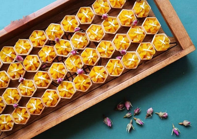 بعد اضافه کردن شربت باید روغن مایع و کره و گلاب را اضافه کنید و هم بزنید و مجدد قابلمه را روی حرارت قرار دهید و هم بزنید تا آب اضافی حلوا تبخیر شود و کمی به روغن بیفتد و به اصطلاح گهواره شود. وقتی به این مرحله رسید از روی حرارت بردارید و همان طور که داغ است سریع داخل ظرف یک بار مصرف یا داخل دیس کشیده و تزیین کنید. نوش جان