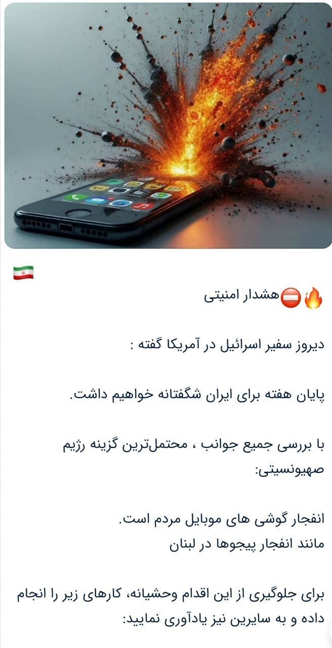 در روزهای اخیر در گروه های فضای مجازی پیامی ارعاب آمیز منتشر که میشود که به نقل از سفیر اسرائیل در آمریکا نوشته «آخر هفته برای ایران شگفتانه داریم» برخی کاربران نیز میگوید رژیم قرار است عملیاتی مشابه با انفجار پیجرها در لبنان انجام دهد.